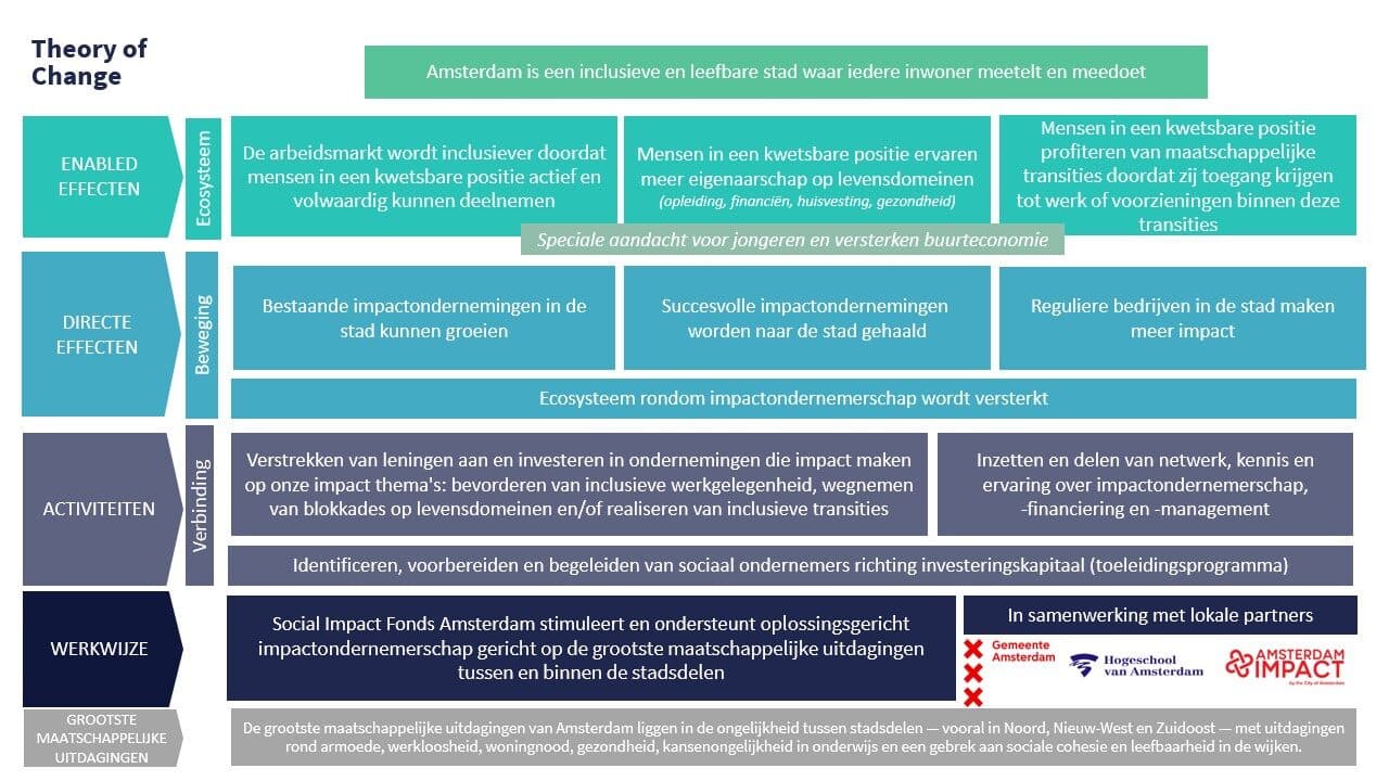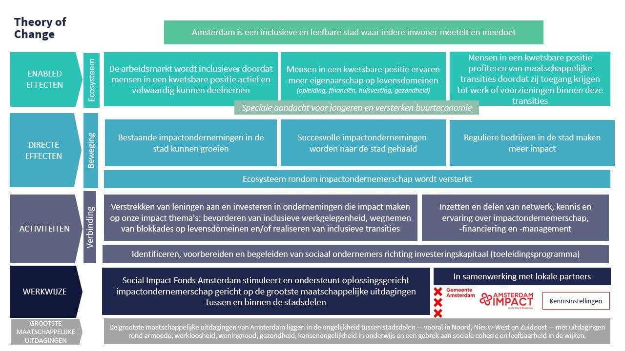 Onze investeringsstrategie gaat hand in hand met onze verandertheorie. Dit impactmodel is opgesteld in samenwerking met Impact House by Grant Thornton en Impact Centre Erasmus (ICE). Aan de hand van deze kaders toetst SIF Amsterdam haar werk en investeringen.