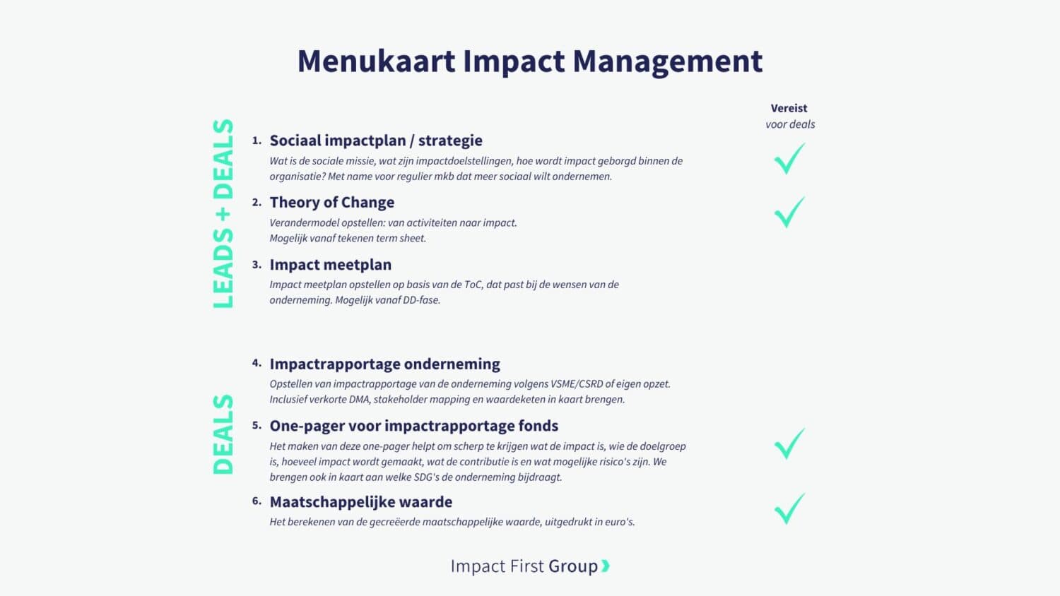 Het aanvraagproces borgt dat impact vanaf de eerste screening tot en met due diligence structureel en meetbaar wordt geïntegreerd. We gebruiken hiervoor de dimensies van het Impact Management Project als basis: wat is de impact, wie ondervinden de effecten, hoeveel impact is er gemaakt, wat is de contributie van de onderneming en wat zijn mogelijke risico's?