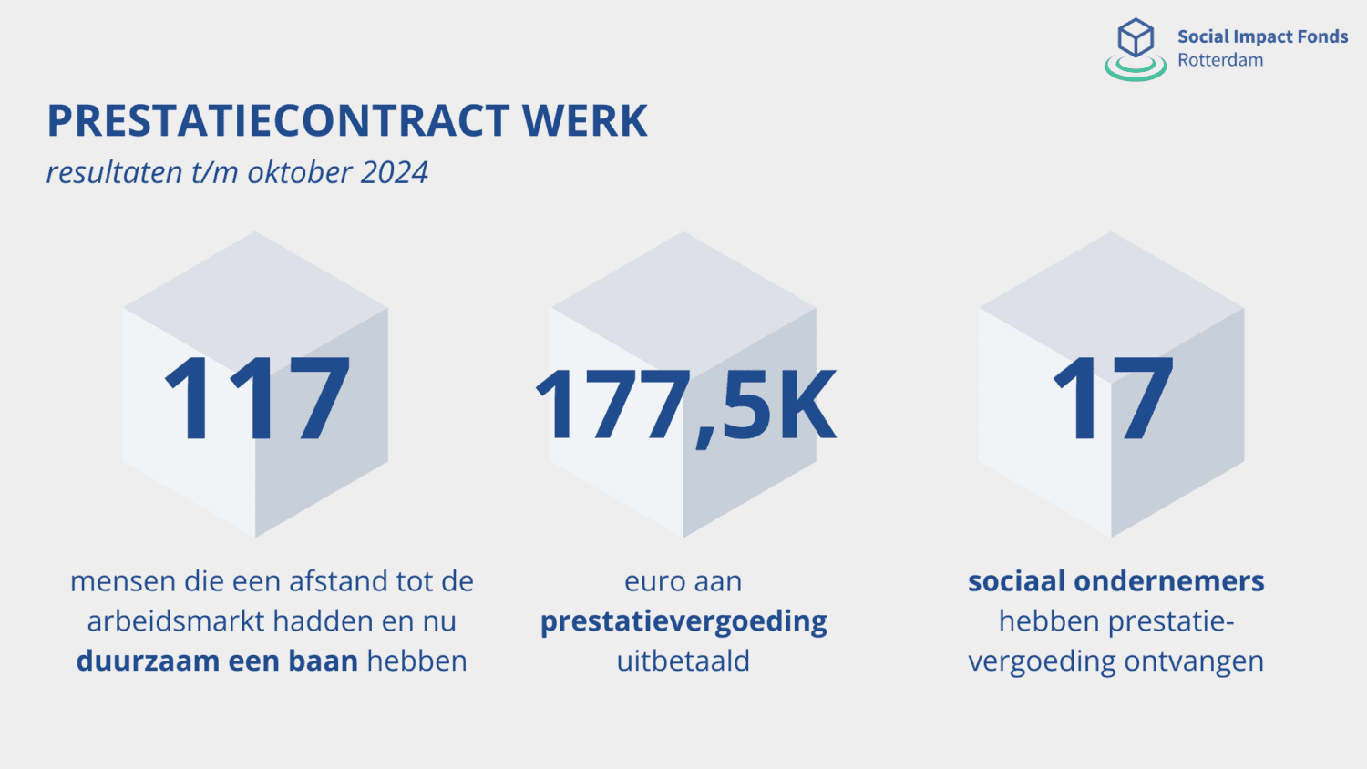 Prestatiecontract Werk is een initiatief van de Rotterdam Impact Coalitie in samenwerking met de Gemeente Rotterdam, en wordt uitgevoerd door Stichting Impactfinanciering (onderdeel SIF Rotterdam). Iedere sociale ondernemer die mensen met afstand tot de arbeidsmarkt duurzaam in dienst neemt ontvangt een financiële vergoeding vanuit de Gemeente.